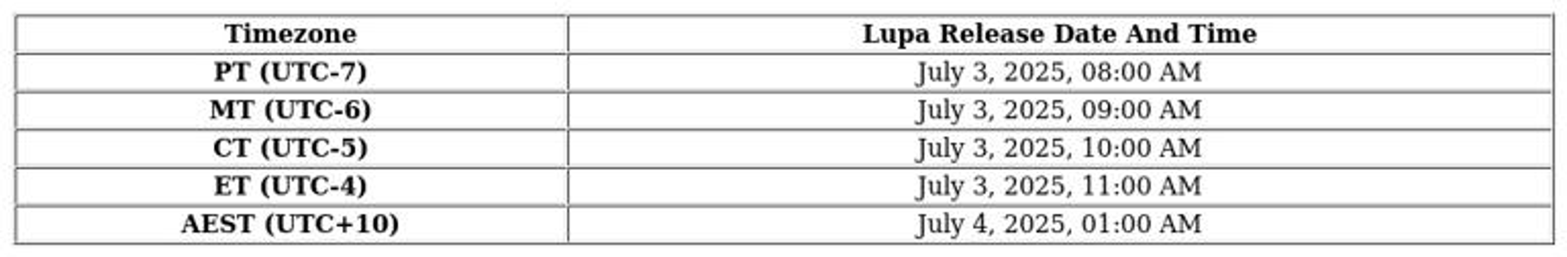 Lupa Launch Schedule